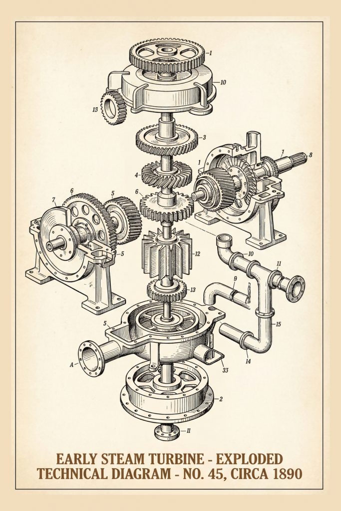 Before electricity lit our cities and factories hummed through the night, the world ran on steam, steel, and ingenious engineering. This exploded technical diagram of an early steam turbine (No. 45, circa 1890) captures that moment in history — when human innovation was turning pressure and heat into rotational power, pushing industry into a new age.