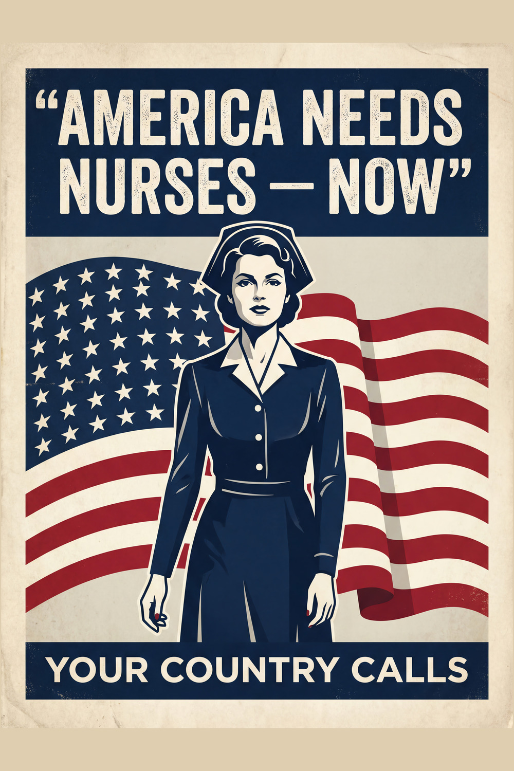 This bold World War II–era recruitment poster captures the urgency and resolve of America’s call for nurses during the war years. Dominating the composition is a uniformed nurse standing firmly before a sweeping American flag, her posture confident and unwavering. The imagery conveys readiness, responsibility, and national purpose — qualities essential to the wartime medical effort.