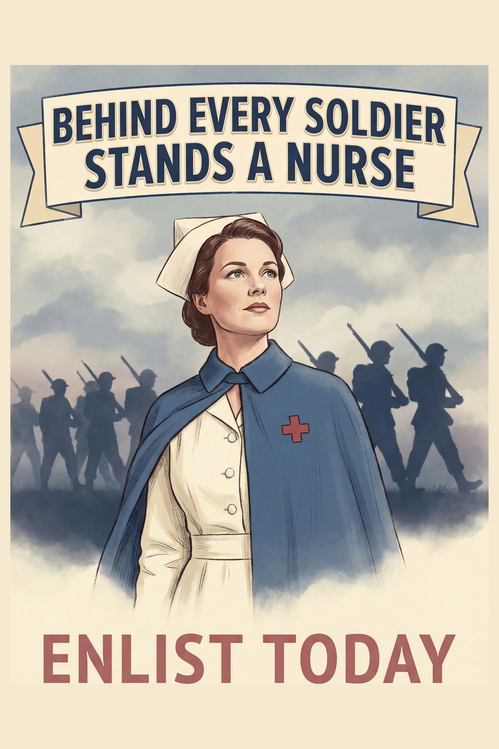 This evocative World War II–era recruitment poster pays tribute to the indispensable role of American nurses who supported soldiers throughout the war. Titled “Behind Every Soldier Stands a Nurse,” the artwork places a confident, composed nurse in the foreground, while silhouetted infantry advance behind her through mist and shadow. The composition powerfully conveys interdependence — strength at the front made possible by care behind the lines.
