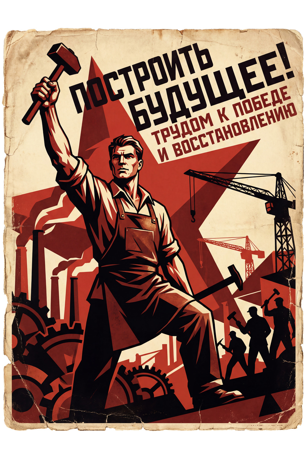 “Build the Future — Labor Toward Victory” is a striking example of Soviet reconstruction-era propaganda, created to inspire industrial growth and collective effort in the aftermath of conflict. At its center stands a commanding worker, hammer raised high, framed against a red star and a backdrop of factories, cranes, and marching laborers.