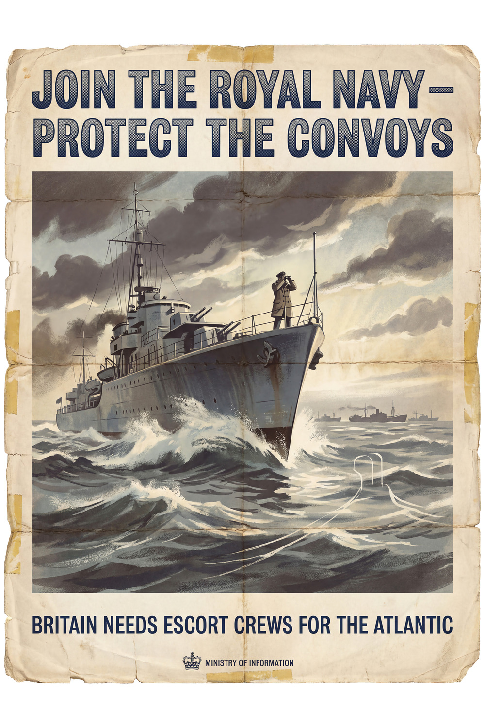 Originally issued by Britain’s Ministry of Information during World War II, this striking recruitment poster calls on citizens to “Join the Royal Navy – Protect the Convoys.” It reflects the critical importance of escort crews during the Battle of the Atlantic, where Allied naval forces defended supply lines against relentless submarine threats.