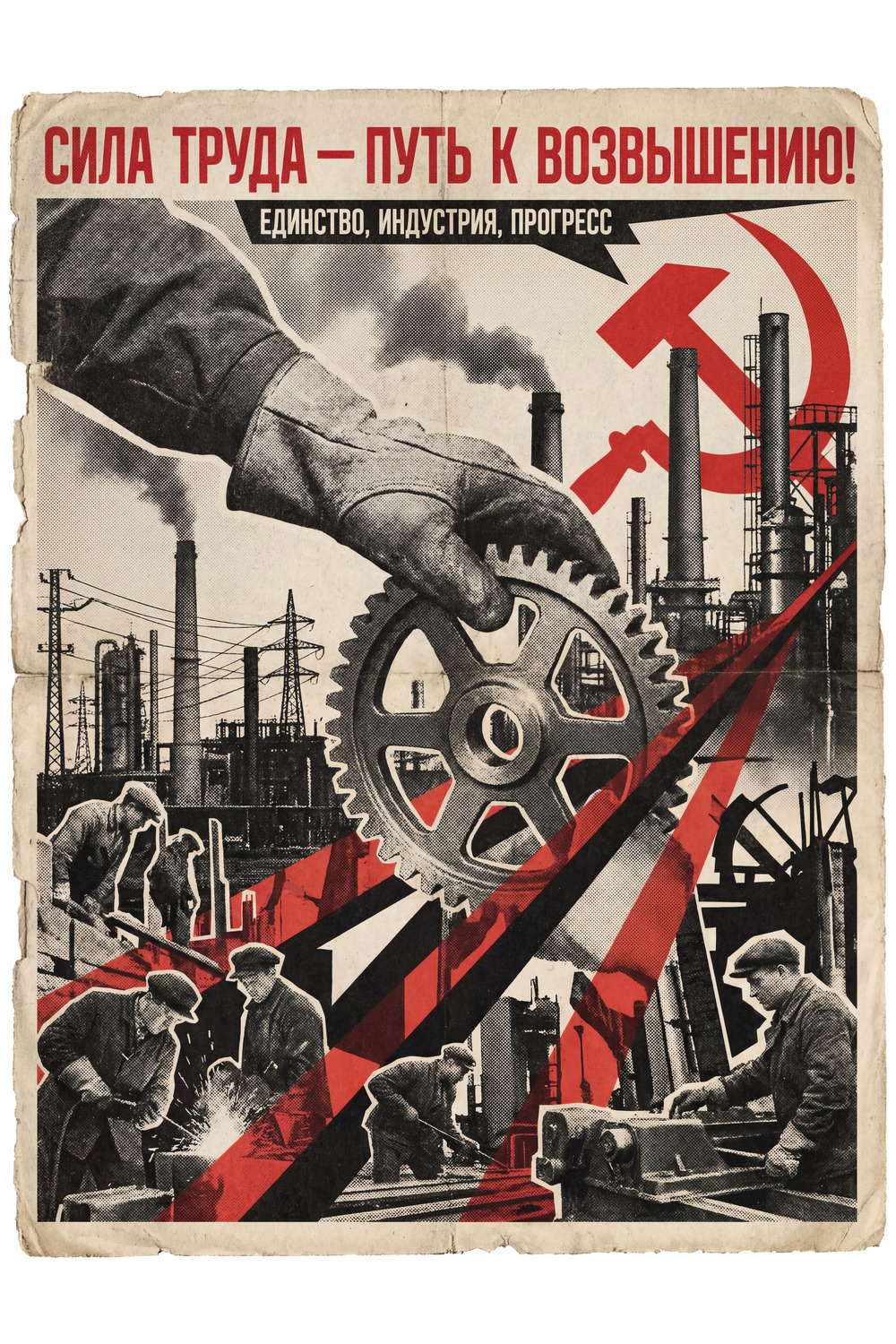 “Strength of Labor — Unity, Industry, Progress” is a commanding example of Soviet reconstruction-era propaganda, designed to elevate the role of industrial labor in shaping the nation’s future. At the center of the composition, a massive gloved hand grips a steel gear, symbolizing control over industry and the power of the working class.