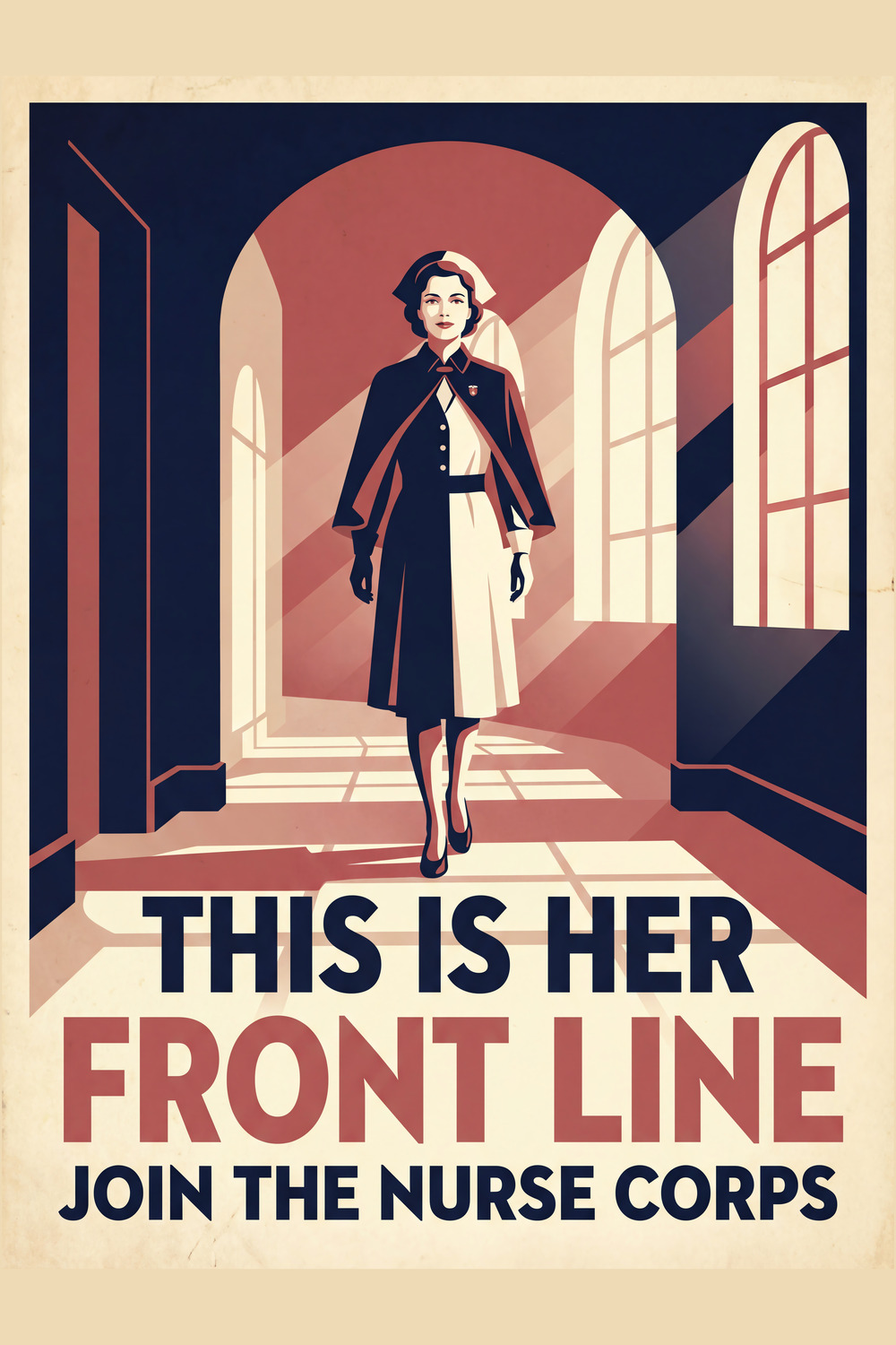 Unlike traditional battlefield imagery, this poster powerfully reframes the concept of the “front line.” The nurse’s calm posture, forward stride, and composed expression convey authority, resilience, and purpose. Her uniform and cape reflect period-accurate U.S. Nurse Corps attire, emphasizing professionalism and readiness rather than sentimentality.