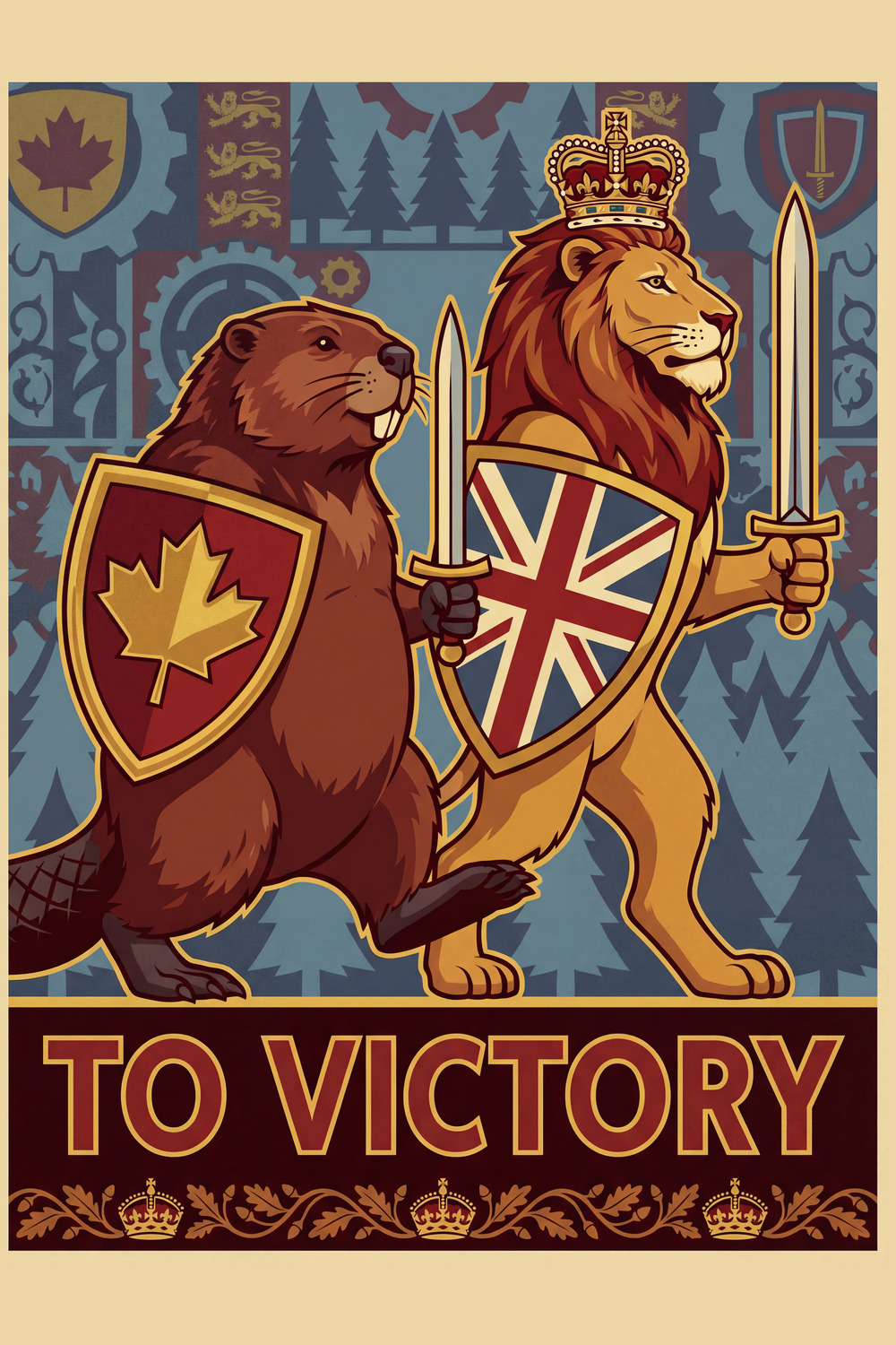 Rendered in a rich, heraldic art style, the image features two iconic symbols — the Canadian beaver and the British crowned lion — marching side-by-side as warriors. Armed with swords and shields bearing the maple leaf and Union Jack, they embody loyalty, courage, and shared purpose. The decorative background of gears, leaves, and national motifs reinforces the industrial and cultural strength behind the wartime partnership.