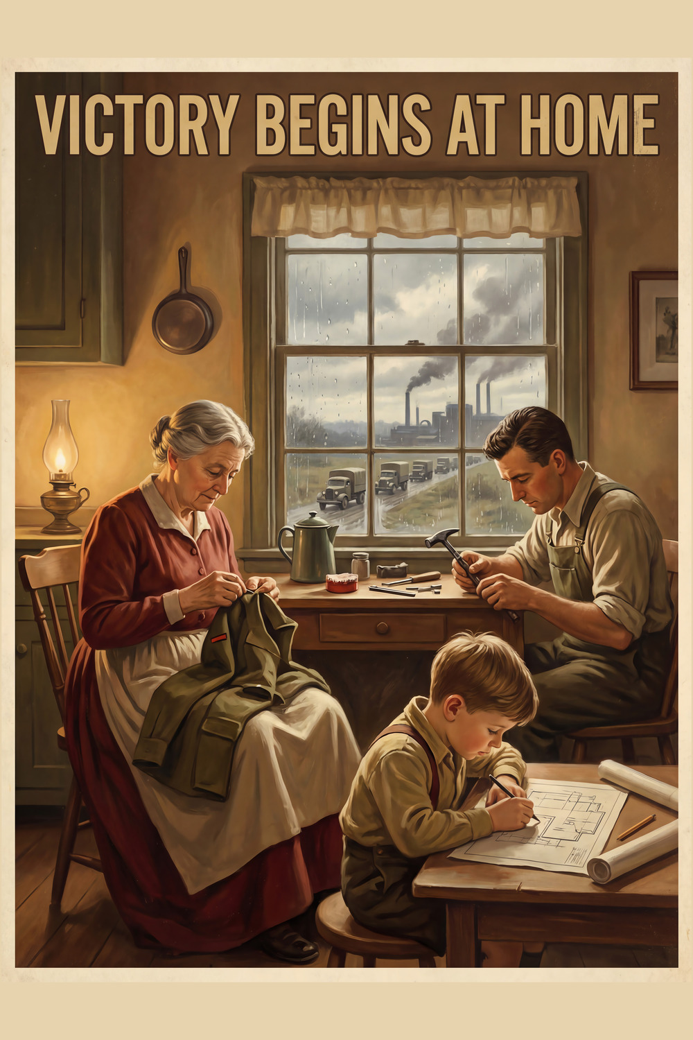 Rendered in a warm painterly style, this poster captures the emotional heart of WWII propaganda: sacrifice, unity, and the belief that victory was built not just in factories and battlefields, but inside the homes of ordinary Canadians.