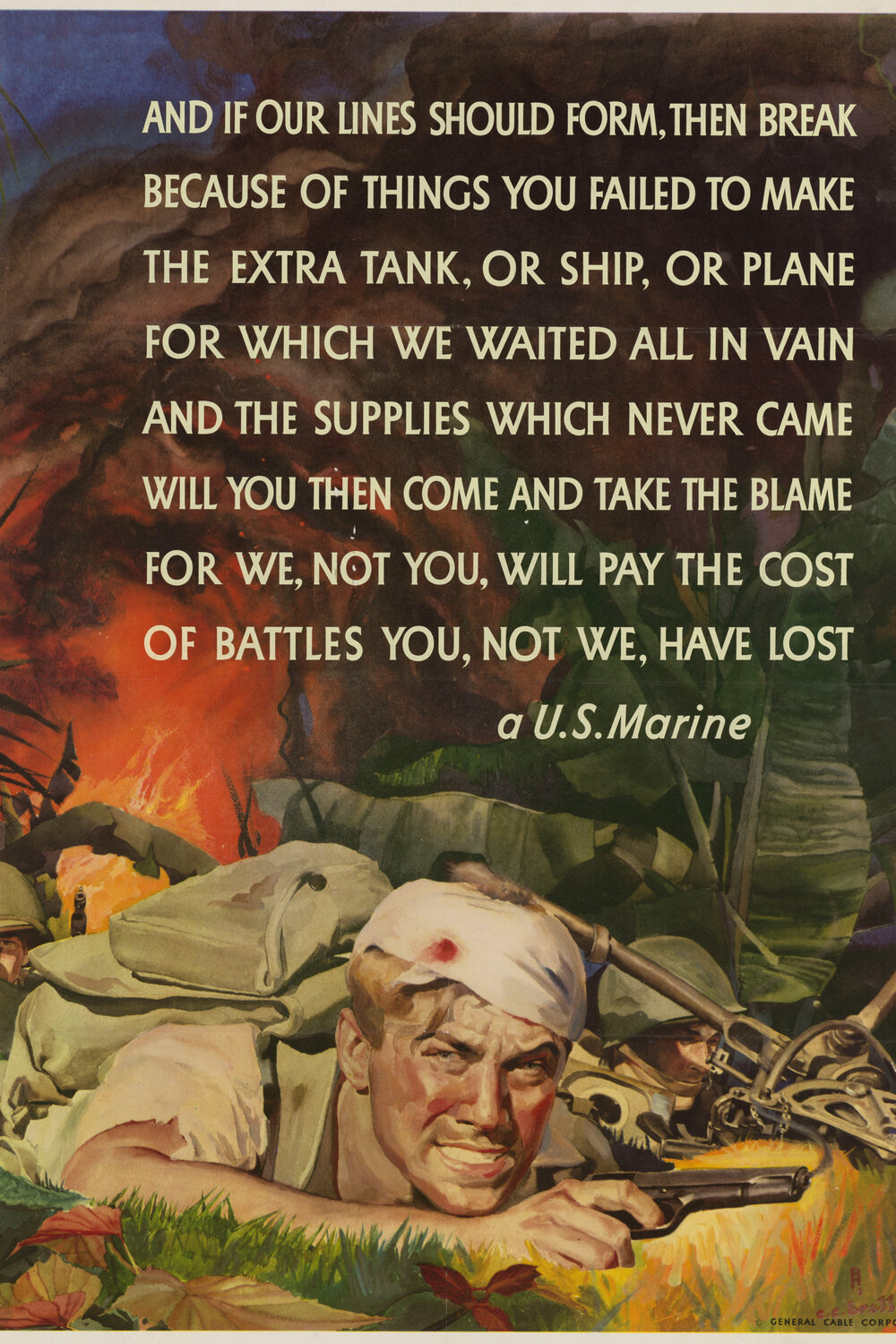 A sobering and powerful World War II home front poster featuring a poignant poem from the perspective of a wounded U.S. Marine. This rare piece of propaganda was designed to emphasize the life-and-death consequences of industrial production delays.